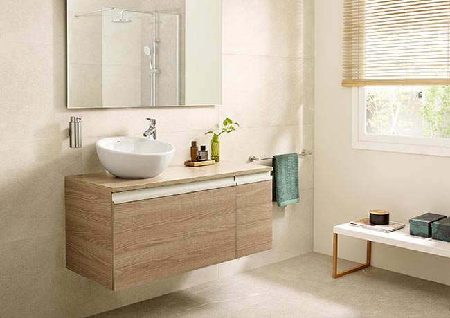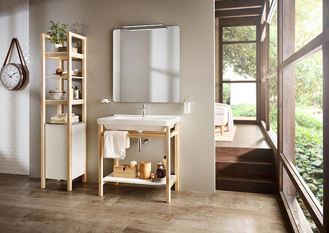 If you prefer a more modern option, the elegance of ash is present in the Natura structure units or in the Heima solutions, to be combined with an endless array of basins. There is also the Lander collection and its floorstanding rustic furniture units that can opt for the City Oak finish, also available in the Savana countertops, with damp-proof and water-resistant wood.