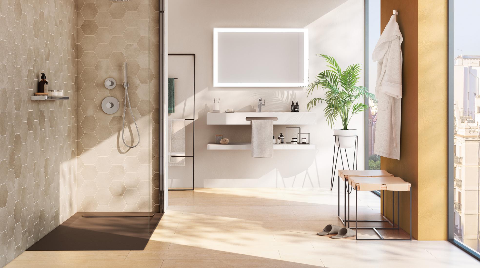If you go for noble materials, you will be seduced by the unique relief of the Helios resin shower trays, which replicate the warmth of wood. Manufactured with natural pigments, you can choose from six finishes: White, Light Aged Wood, Aged Wood, Black, Cream or the shower base in Slate; all of them fit perfectly in a wide range of interior design styles.