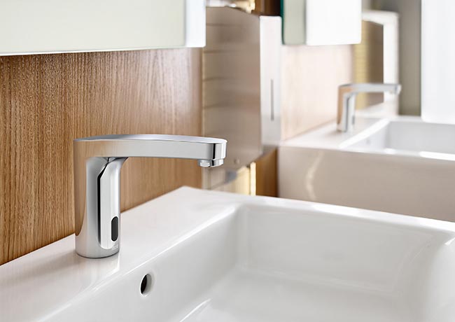 Avoid hand contact in the bathroom with a faucet with presence sensor that does not require any electricity.