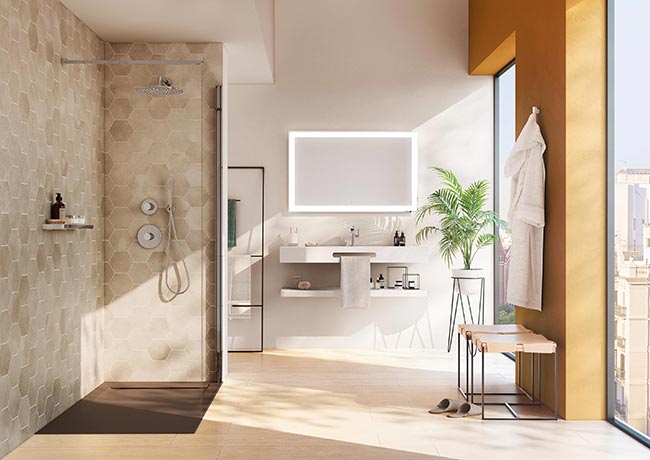 If you have the privilege of having a spacious bathroom you can forget any restrictions and leave behind any feeling of constriction by installing big shower trays in different materials. With a cut-to-size option and in different colors, you will find the Terran, Helios and Aquos resin shower trays, the Cratos antislip vitreous china models or the pleasant texture of the Modo shower trays, manufactured in Surfex®, Roca’s Solid Surface.